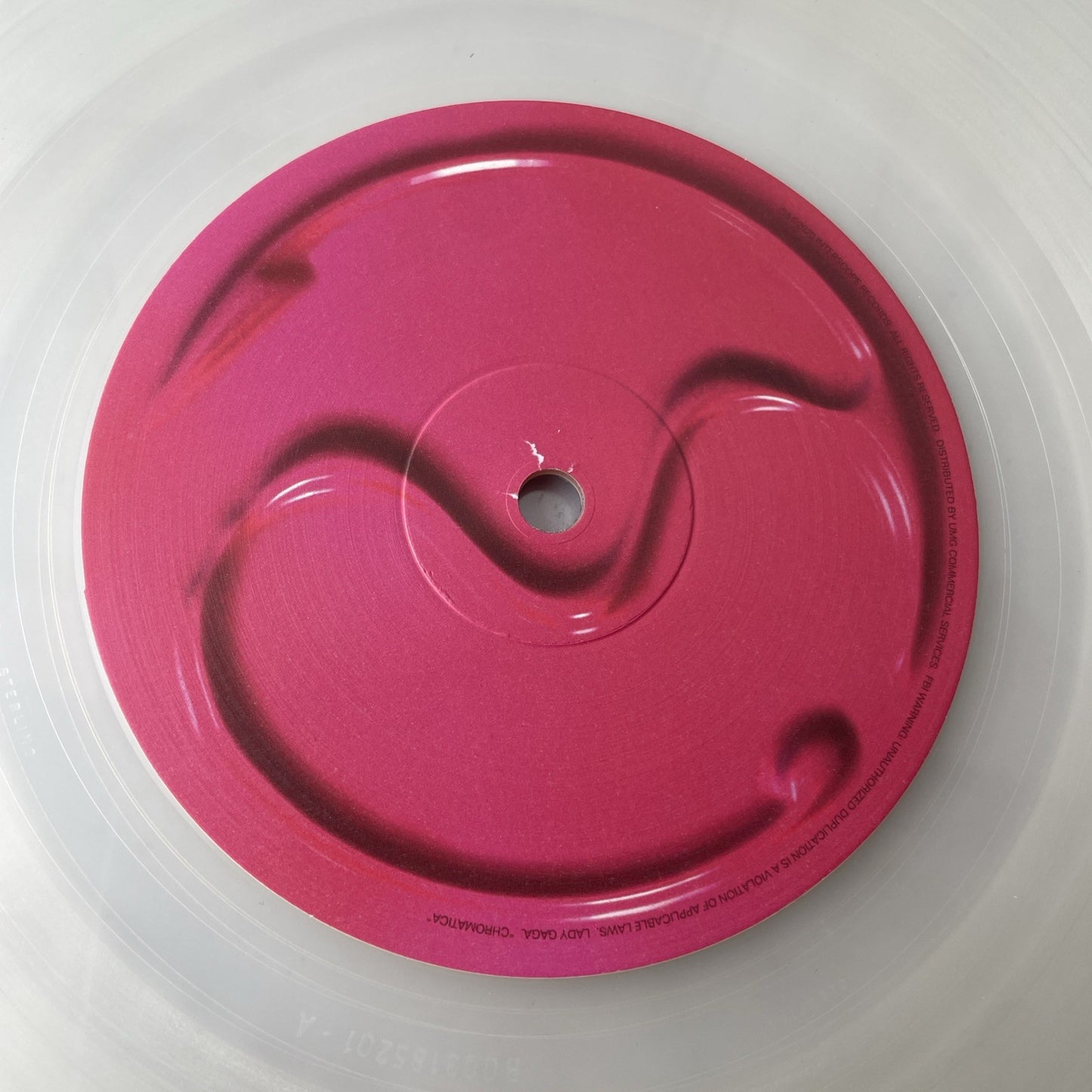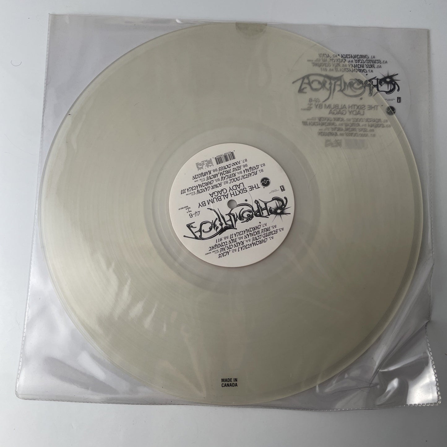 The product is a used very good condition chromatica clear vinyl LP by Lady Gaga. Released in 2020 by Interscope records, this rock genre LP features colored vinyl and is graded as very good plus. The clear vinyl adds a unique touch to the record, making it a standout addition to any music collection. With a very good sleeve grading, this LP is a must-have for fans of Lady Gaga and vinyl records.
