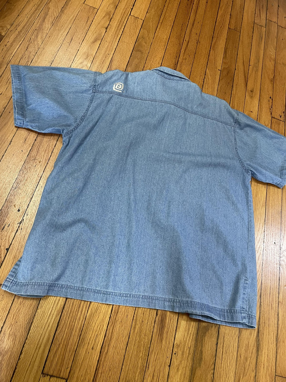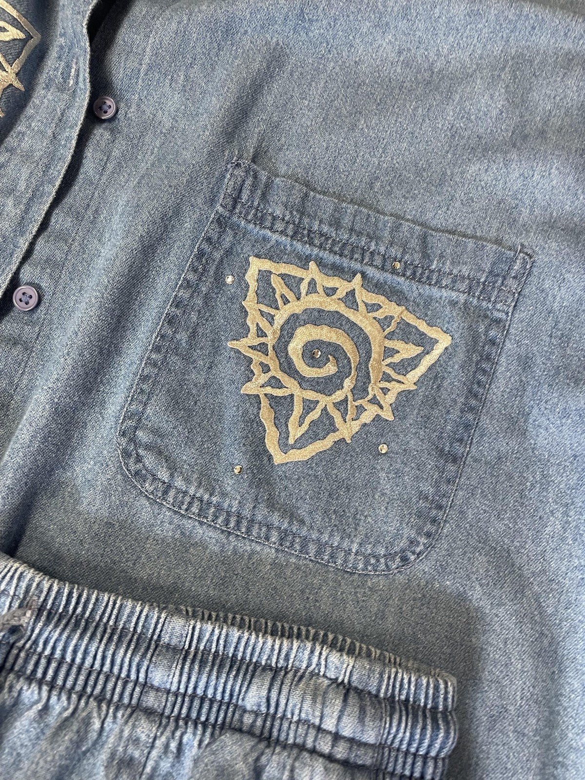 Item: Matching two-piece denim set featuring a short-sleeve button-up shirt and cropped pants