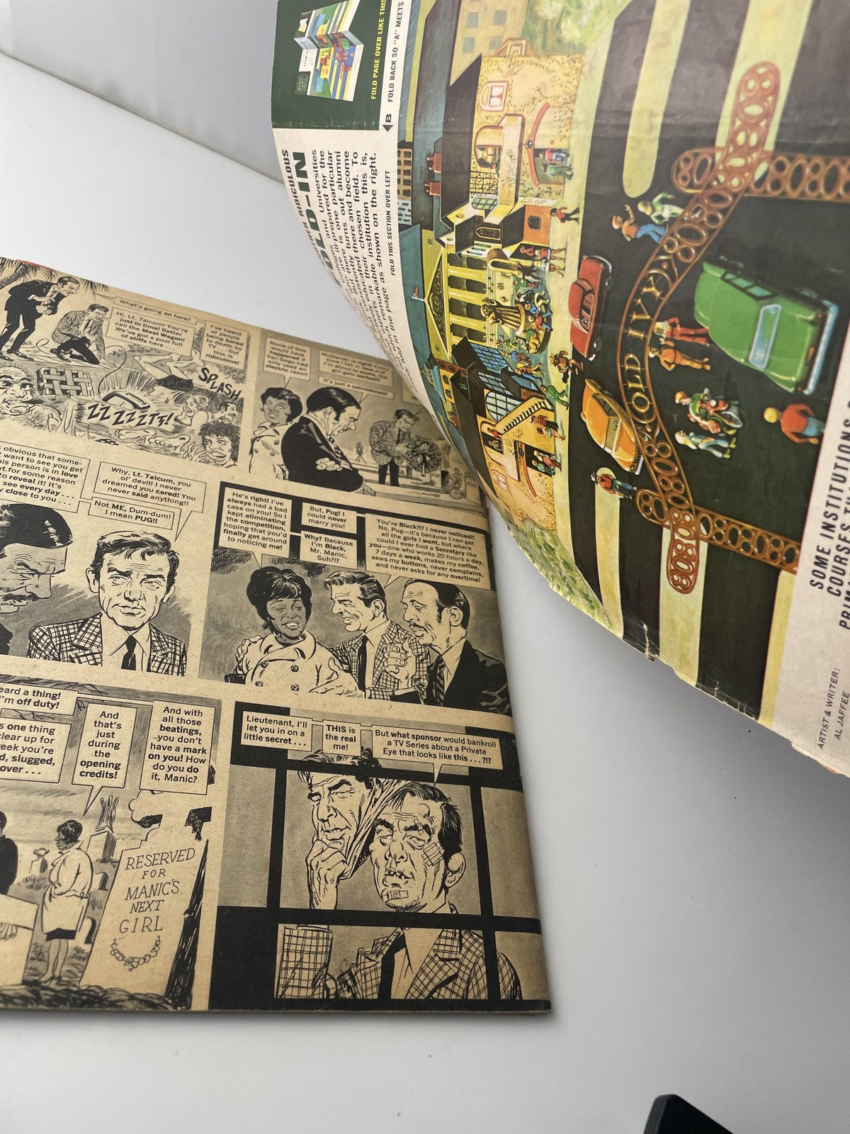 Includes original contents, comic strips, parodies of politics, television, social issues, and detailed illustrations. Table of contents and inside art visible in photos.