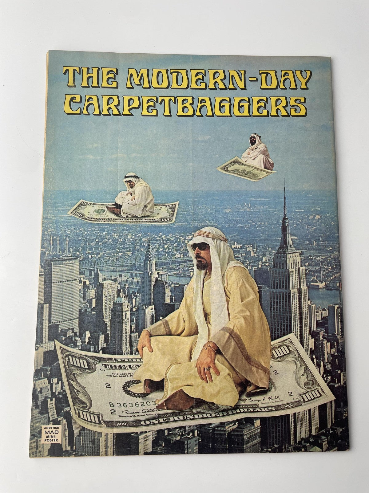 Back cover includes 'The Modern-Day Carpetbaggers' MAD mini-poster, a humorous take with Middle Eastern figures on flying $100 bills over New York City skyline.